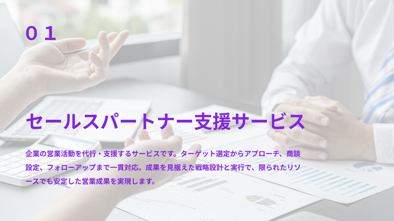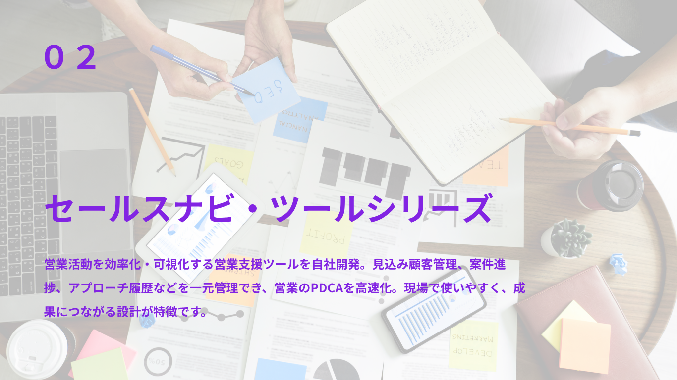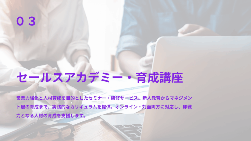 私たちは、企業の営業課題を解決するために、営業支援・マーケティング支援を中心としたサービスを展開しています。営業活動を効率化・成果最大化する自社開発ツールの提供に加え、人材育成を目的としたセミナーや教育プログラムを企画・運営。戦略から実行、育成までを一貫してサポートし、成果の再現性と持続的な成長を実現します。